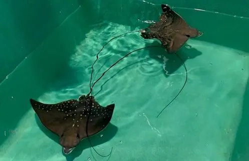 Two little eagle rays Aetobatus ocellatus were born at Nausicaá on the 10th of August 2022. The day before, the aquarists in charge of the large tank had isolated the pregnant ray in the auxiliary tank to allow it to complete its gestation period in complete peace and calm.