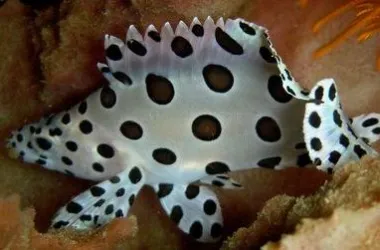 Die charakteristischen Tupfen auf seinem Fell sind im Jugendstadium größer, aber zahlreicher, wenn der Zackenbarsch das Erwachsenenalter erreicht.