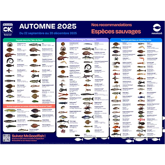 Every 3 months, at each change of season, Mr.Goodfish and its committee of experts determine which species should be preferred for sustainable seafood consumption. There are recommendations for every coastal front.