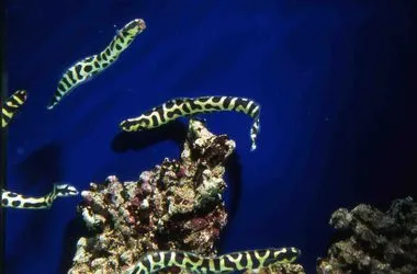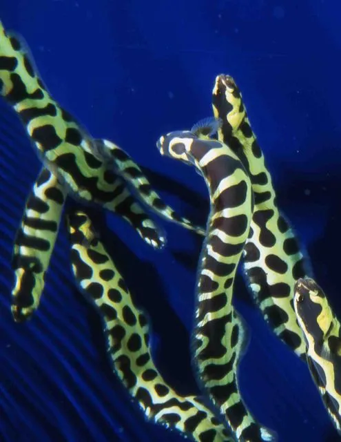 It has a body shape similar to that of an eel. It can measure up to 30 cm. Because their coat resembles that of the eel catfish, a species with venomous fins, they confuse their predators, who keep their distance. Then as they grow, convict blennies disperse, move closer to the sea floor, and the appearance of their coat changes.