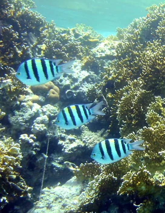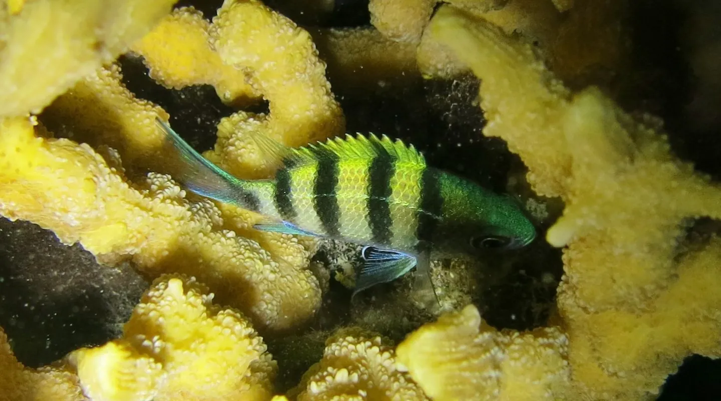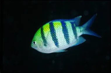 Although classified as "Least Concern" by the IUCN, the Abudefduf vaigiensis sergeant major fish is vulnerable to coral reef degradation due to climate change, pollution and overfishing.