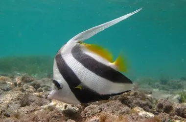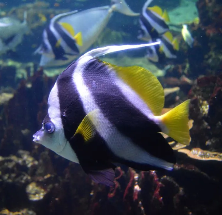 - This tropical fish is distinguished by its dorsal fin, which extends in a long white filament that gives it its name of "bannerfish".