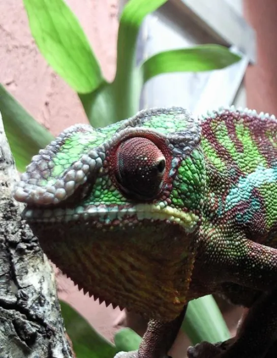 The panther chameleon Furcifer pardalis can change colour by mimicry. It is a means of communicating with its fellow creatures. This colour change may be in response to temperature, light or emotions such as fear or anger.