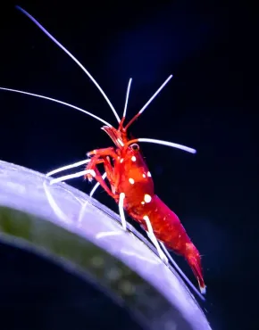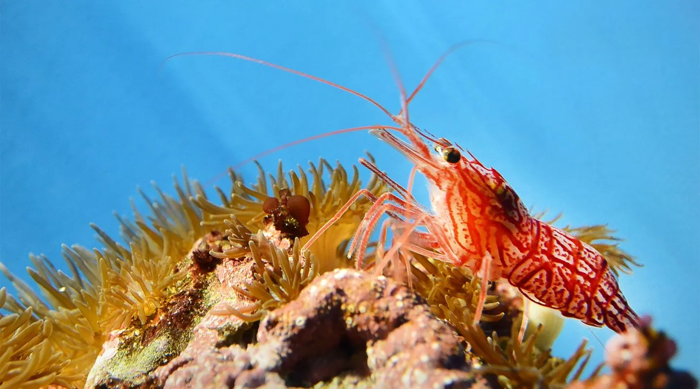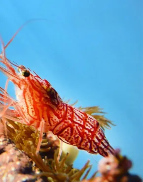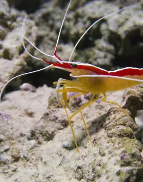 This small shrimp measures no more than 5 cm on average. The peppermint shrimp is a small tropical shrimp with longitudinal red stripes. This quiet and discreet shrimp lives in groups and is mostly active at night.