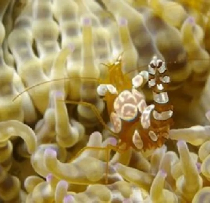 The squat shrimp lives in small groups of 6 to 8 individuals around the same anemone