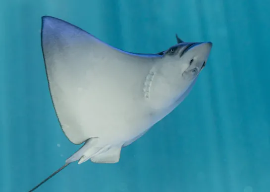 Eagle rays (Aetobatus ocellatus) belong to the Aetobatidae family. They also have a diamond-shaped body and swim by undulating their large pectoral fins, but their feeding habits are very different.
