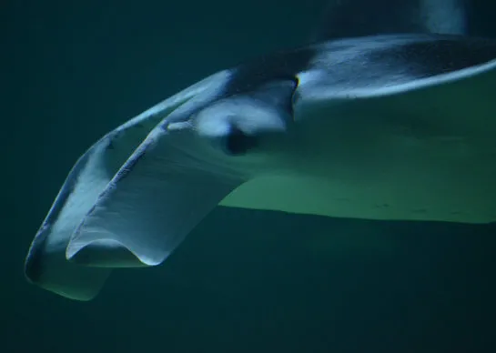 The Oceanic Manta Ray Mobula birostris is the largest ray in the world. The manta ray at Nausicaá now measures 4 metres across and weighs 800 kg. You can't miss it! It moves by undulating its pectoral fins, which gives the impression that it is flying over the water. It can be recognised by the two cephalic protuberances on either side of its large mouth, which act as a "funnel" to better direct food towards its mouth.