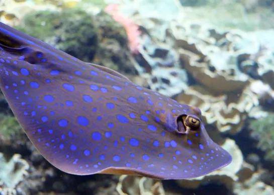 In the lagoon, a blue-spotted stingray swims among tropical species. Smaller than its counterpart in the main basin, it is easily recognisable by the blue spots scattered across its round body.