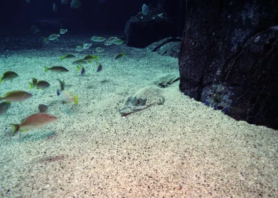 If there is one fish that intrigues people, it is the guitarfish. Standing in front of the large tank, visitors ask themselves: "Is it a shark? Why does it have such a flat head?"