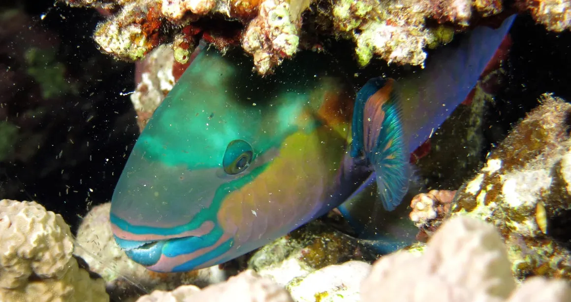 Photo du poisson perroquet : Jérôme Paillet (2014). Poisson-perroquet dormant (Scarus). Ifremer.