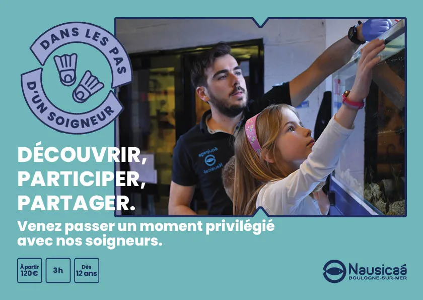 Cette expérience inédite sera l’occasion privilégiée de vivre des instants magiques et de partager la passion du métier de soigneur, tout en étant sensibilisé à la sauvegarde des océans et des espèces. Cette demi-journée sera également l’opportunité d’apprendre de nombreuses anecdotes amusantes et étonnantes sur tous les animaux présents à Nausicaá…et de repartir avec un diplôme d’apprenti soigneur, le début d’une vocation.