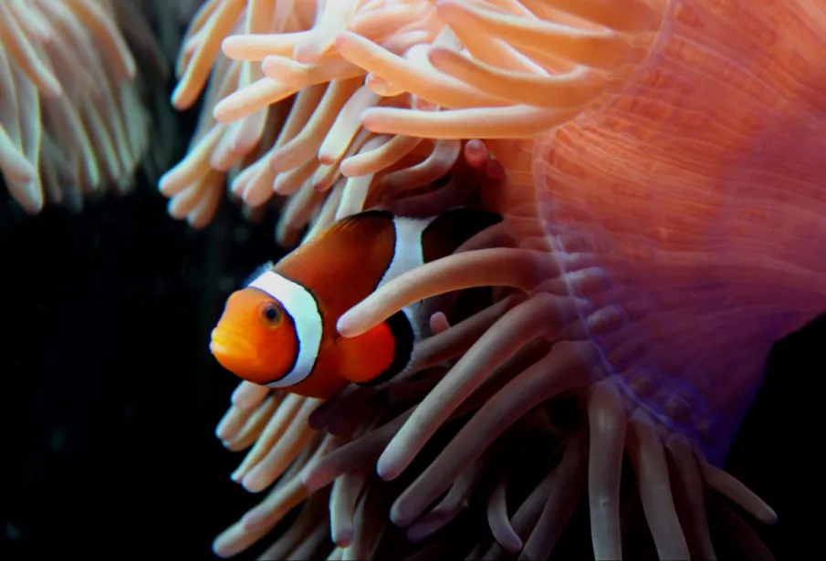 Le poisson-clown ocellé (également connu sous le nom de Némo) vit en symbiose avec une anémone de mer géante urticante. Elle le protège des prédateurs tandis qu’il la maintient en bonne santé. Le poisson-clown ocellé passe toute sa vie dans l’anémone qu’il a choisie. Chaque anémone abrite généralement une femelle, son partenaire mâle et leurs petits.