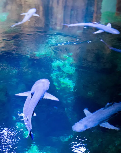 Les requins à pointes noires ont rejoint Nausicaá grâce à un partenariat et des échanges avec les aquariums du Trocadéro à Paris et de Liège en Belgique. Originaires des lagons de l’Indo-Pacifique, ils se reconnaissent à la marque sombre qui orne l’extrémité de leurs nageoires. Ces animaux à la fois fascinants et vulnérables rejoignent désormais poissons-fusiliers, poissons-anges et bien d’autres espèces dans un bassin conçu comme une fenêtre ouverte sur la pleine mer tropicale.