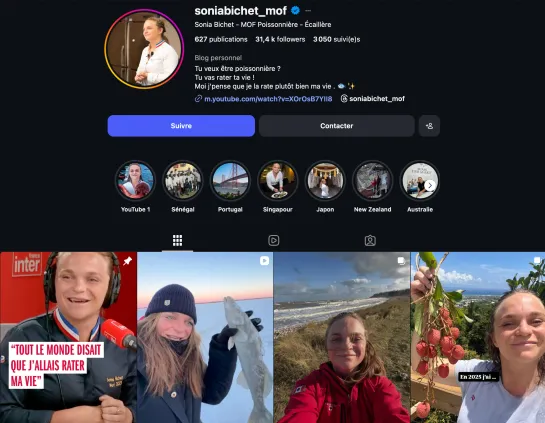 Sur Instagram, Sonia Bichet incarne l’excellence des métiers de la mer. Meilleur Ouvrier de France poissonnier-écailler, elle partage son savoir-faire : maîtrise des découpes, préparation des coquillages, art des plateaux de fruits de mer et respect du produit.