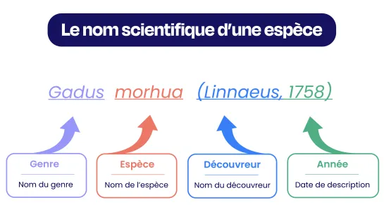 Le premier mot porte toujours une majuscule et qualifie le genre de l’animal. L’épithète qui suit précise l’espèce au sein du genre. À ce nom s’ajoutent le nom de la personne qui a décrit l’espèce en premier et la date.