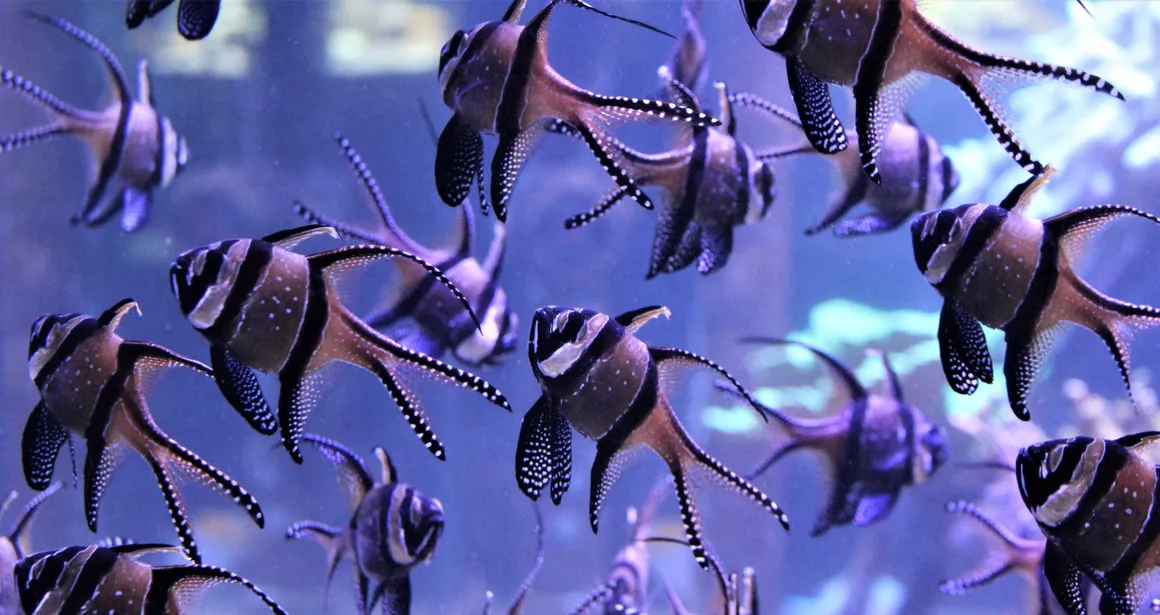 Qui sont-ils ? Ce sont des petits poissons cardinaux de Banggaï (Pterapogon kauderni) qui sont nés récemment dans l’exposition Échappée tropicale.