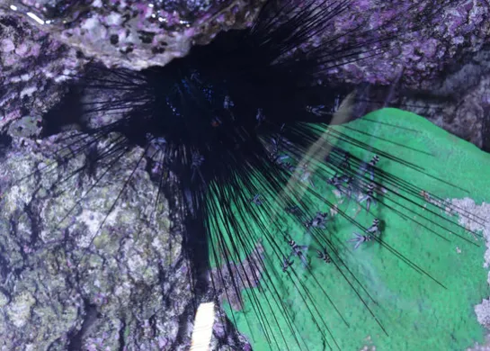 Des jeunes poissons cardinaux se cachent dans les piquants d’un oursin dans l’exposition Échappée tropicale.