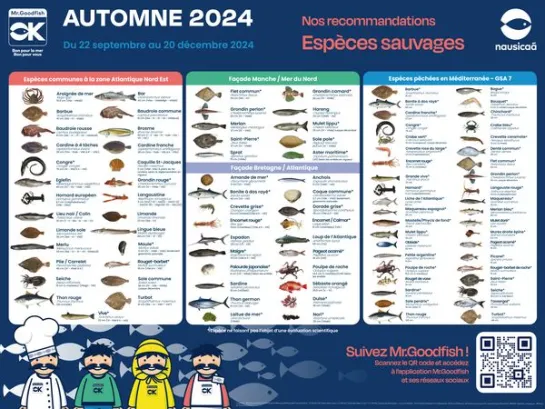 - Le programme Mr.Goodfish a retenu le critère de saisonnalité mais aussi la taille, l’état de la ressource et le statut de l’espèce pour proposer chaque trimestre des recommandations d’espèces à mettre au menu. Elles sont réparties par façade littorale parce que la situation d’une même espèce peut être différente selon sa zone de pêche.