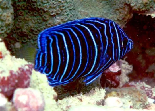 Le poisson-ange géographe Pomacanthus maculosus arbore sur le corps un motif de rayures qui disparaissent à l’âge adulte pour laisser place à une robe unie bleue uniquement marquée d’une tache jaune.