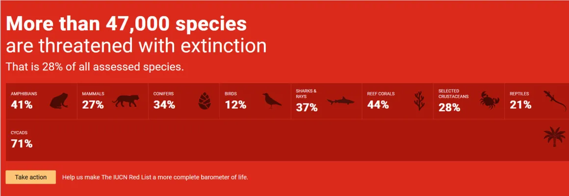 Parmi ces espèces, 41 % des amphibiens, 11 % des oiseaux et 26 % des mammifères sont menacés d’extinction au niveau mondial. C’est également le cas pour 38 % des requins et raies (30 % en 2020), 44 % des coraux constructeurs de récifs (33 % en 2020) et 38 % des arbres.
