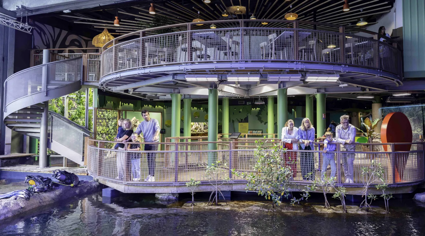 Au cœur de l'exposition "échappée tropicale" le lagon abrite des espèces parmi les plus emblématiques où les minuscules polypes de coraux côtoient les majestueux requins-zèbres. A quelques pas, les limules fouillent le sable pour trouver leur nourriture pendant que le mérou attend patiemment l'heure du repas. Venez découvrir le travail quotidien des soigneurs en assistant au nourrissage commenté de ces animaux.