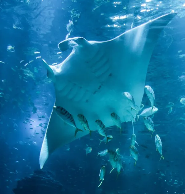 Bien qu’inoffensive pour l’homme, cette immense raie élégante apparaît dans de nombreuses légendes où elle entraine par le fond les bateaux. En réalité, elle est très sociable avec les plongeurs.