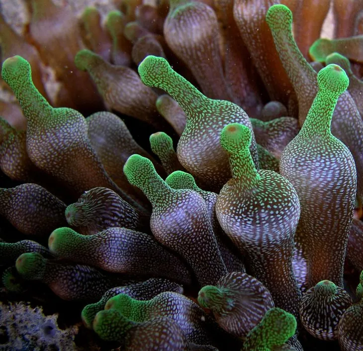 Cette espèce d’anémone se caractérise par des tentacules d’une dizaine de centimètres qui se terminent par une boursouflure, en forme d’ampoule ou de tétine. Les tentacules sont généralement marron mais les extrémités varient et sont rose, violet ou encore rouge ou vert.