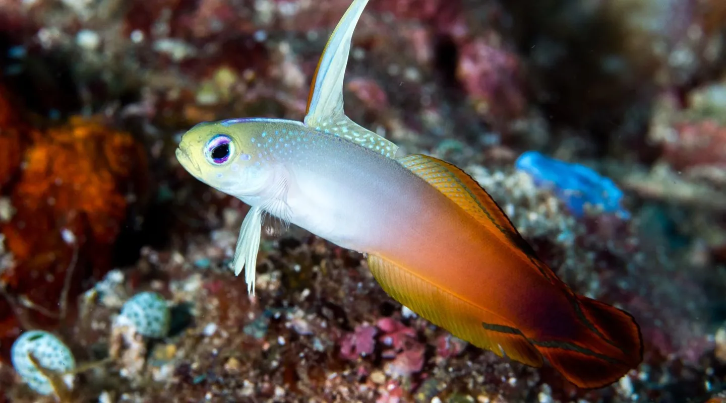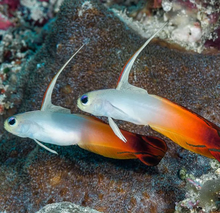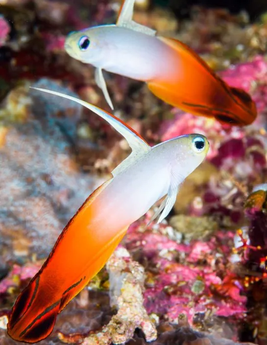 Le gobie de feu se caractérise par un corps allongé et bicolore. L’avant de son corps est blanc tandis que l’arrière se de couleur rouge. Sa première nageoire dorsale se présente sous forme de fanion, agité d’avant en arrière.