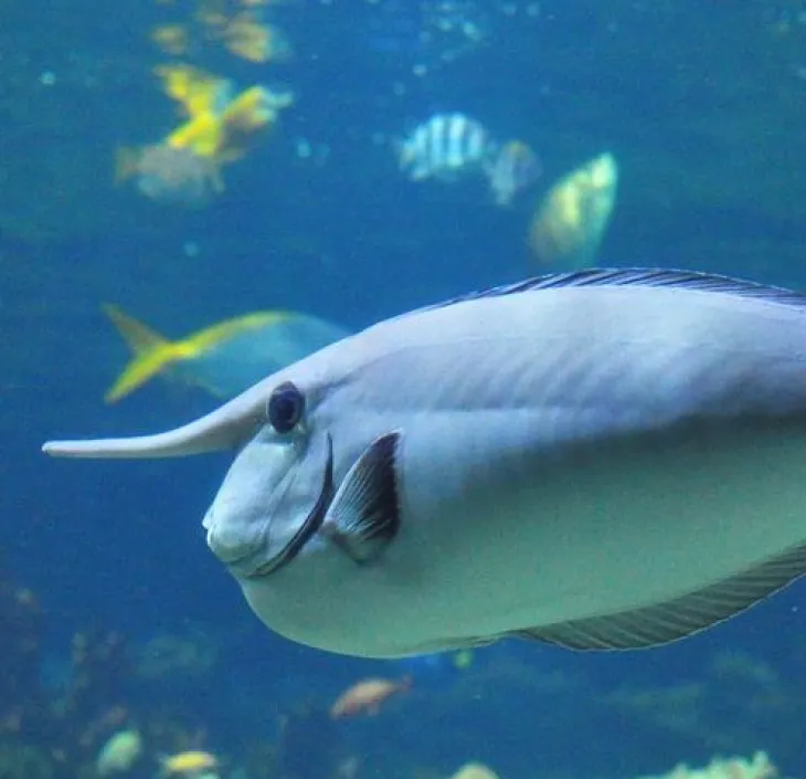 Avec son appendice frontal qui lui vaut le nom de nason licorne, ce poisson tropical au nom latin Naso annulatus se repère facilement. Ce poisson se caractérise par la présence d’épines coupantes comme des scalpels à la base de sa nageoire caudale. Recouvertes d’un mucus toxique, ces épines sont des armes de défense que le poisson utilise en cas d’attaque. Il n’est cependant pas dangereux pour l’être humain.