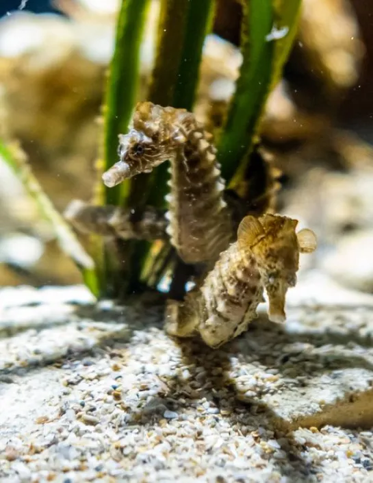Au terme d’une parade nuptiale qui ressemble à un ballet, la femelle dépose ses œufs dans la poche ventrale du mâle. C’est lui qui incube les œufs pendant 4 à 5 semaines. Après l’éclosion, les bébés hippocampes sont expulsés de la poche par de violentes contractions.