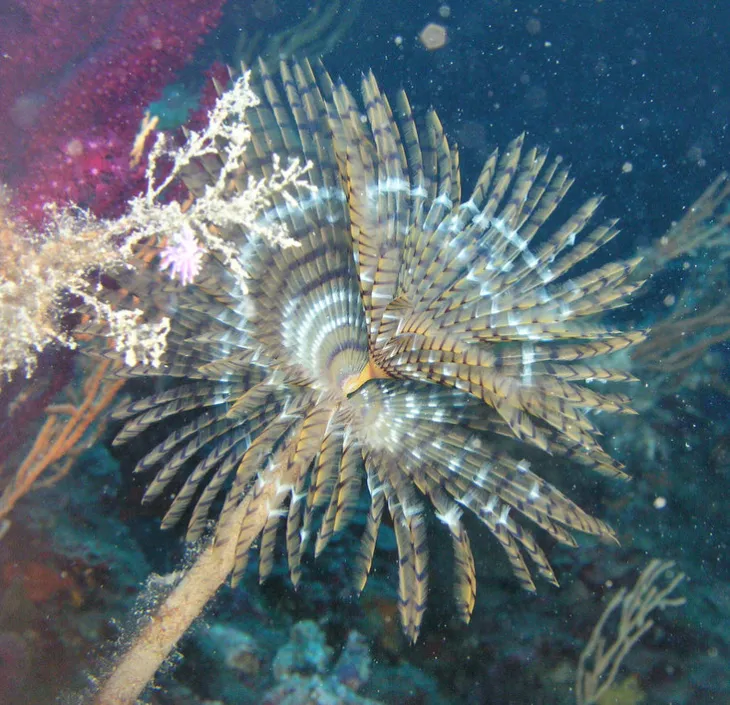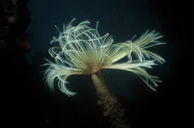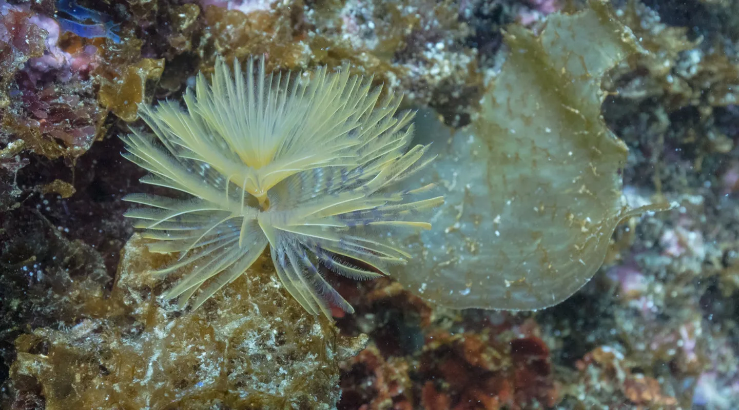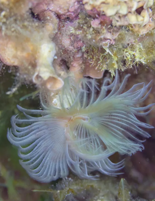 Le double panache de filaments sort et rentre dans le tube à la moindre alerte. Ce panache joue à la fois un rôle de branchies externes mais il piège également les particules suspendues dans l'eau dont le ver se nourrit.