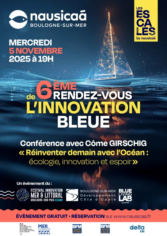 Mercredi 5 novembre 2025 à 19h, organisé par le Blue Living Lab et Boulogne Développement Côte d’Opale dans le cadre du Festival Innovation Mer et Littoral, le 6e Rendez-vous de l’Innovation Bleue qui aura pour invité Côme GIRSCHIG, auteur et conférencier, autour du thème : « Réinventer demain avec l’Océan : écologie, innovation, espoir »
