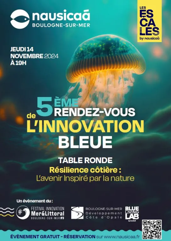 Le 5ème Rendez-vous de l’Innovation Bleue se tiendra le jeudi 14 novembre 2024, à 19h, devant la grande baie de Nausicaá. Organisé par le Blue Living Lab et Boulogne Développement Côte d’Opale dans le cadre du Festival Innovation Mer et Littoral, cet événement propose une table ronde sur la thématique : "Résilience côtière : l'avenir inspiré par la nature".